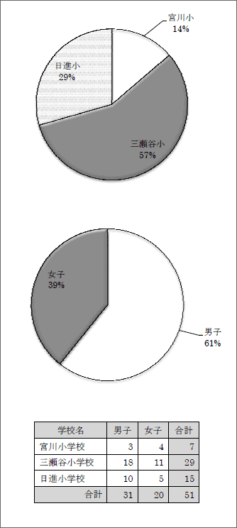 - ■約7割が夏以外は川へ行っていない。夏へも川へ行っていない児童は夏以外にも川には出かけておらず、約3割は年間を通じて川には出かけていない。また、川へ行く回数ではあるが、8回(三瀬谷小学校)と10回(宮川小学校)が多い回数であった。伝統的漁法においては、夏期以外にも頻繁に川で漁をしているため、夏期以外でも川に行く機会があっても不思議ではないが、夏期を含めても川に行く機会が非常に少ないことがわかる。