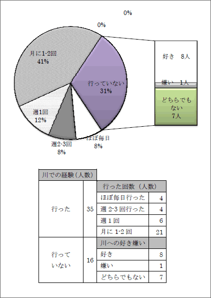 本調査において明らかになったことに、まず「児童の川へ行く回数の少なさ」が上げられる。頻繁に川に行く(週1回以上~)児童数は約3割に止まっている。月1-2回もしくは川に行かない児童の割合は7割に達している。