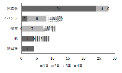 - ■家族で一緒に行ったという回答が圧倒的に多い。他にはイベントや授業で川に行く機会があったと言う回答もあった。家族が子どもたちの遊びに関与しにくい昨今、イベントや授業で川へ行く機会を増加させるのも一つの手段である。