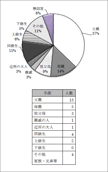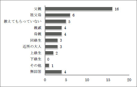- ■父親が圧倒的に多く、次いで祖父母(恐らく祖父)が上げられた。川での遊びや魚採りなどを習得するには家族の関与が大きい。また教えてもらっていないとの回答もあり、誰からも教えられる機会のない子どもが存在することがわかる。