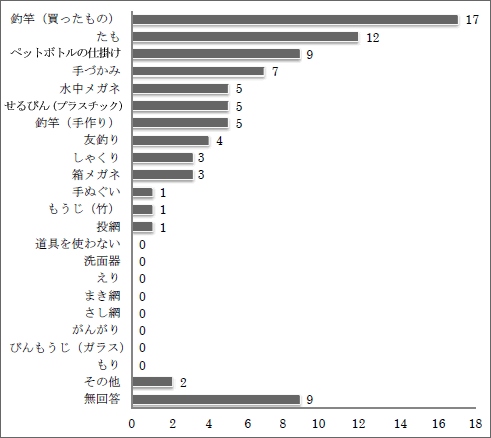 - ■釣り竿(買った物)が一番多く、たも網やペットボトルの仕掛など手軽に購入できたり、自分で作ったりできるものが上位を占めた。ただ手作りの釣り竿や友釣り、しゃくり、もうじ(竹)等伝統漁法を実践した子も少数ながら存在する。