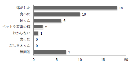 - ■逃した人が最も多かった。アユとアマゴは食用にされるが、その他の魚は雑魚であり、食料に不自由しない現代では食べられることが少ない。逃したとの回答が最も多かったと言うことは、レジャーの一種として魚採りをしたと推察できる。